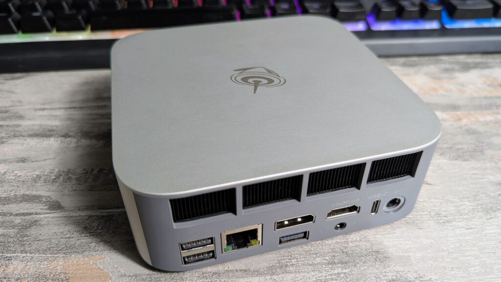 Auf der Rückseite befinden sich zwei USB 3.2-Anschlüsse, ein 2.5Gb-Ethernet-Anschluss, ein DisplayPort 1.4-Anschluss und ein USB 2.0-Anschluss. Danach folgen ein HDMI-Anschluss, ein zweiter 3,5-mm-Audioanschluss, ein USB-C-Anschluss und der Stromanschluss.