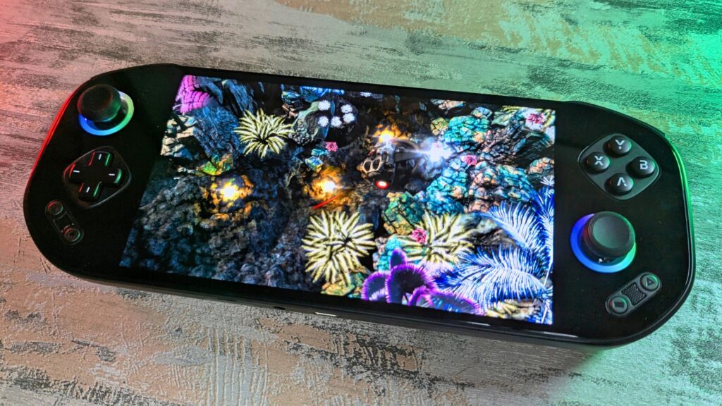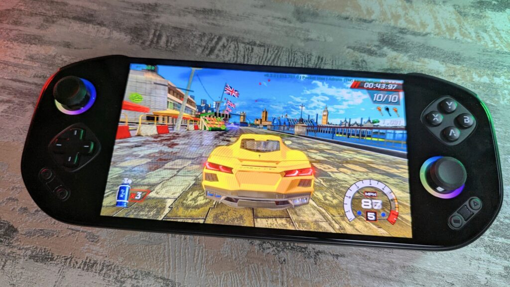 On the front is a great-looking 7-inch AMOLED touchscreen display, supporting up to 1920×1080 resolution with 800 nits of brightness. Colours look excellent and really pop on the panel. It also supports refresh rates from 60Hz up to 144Hz, which puts it among the highest-specced Android gaming handhelds in this area.