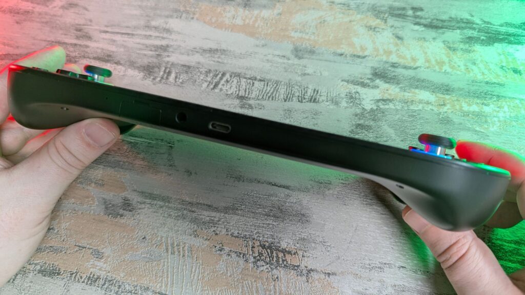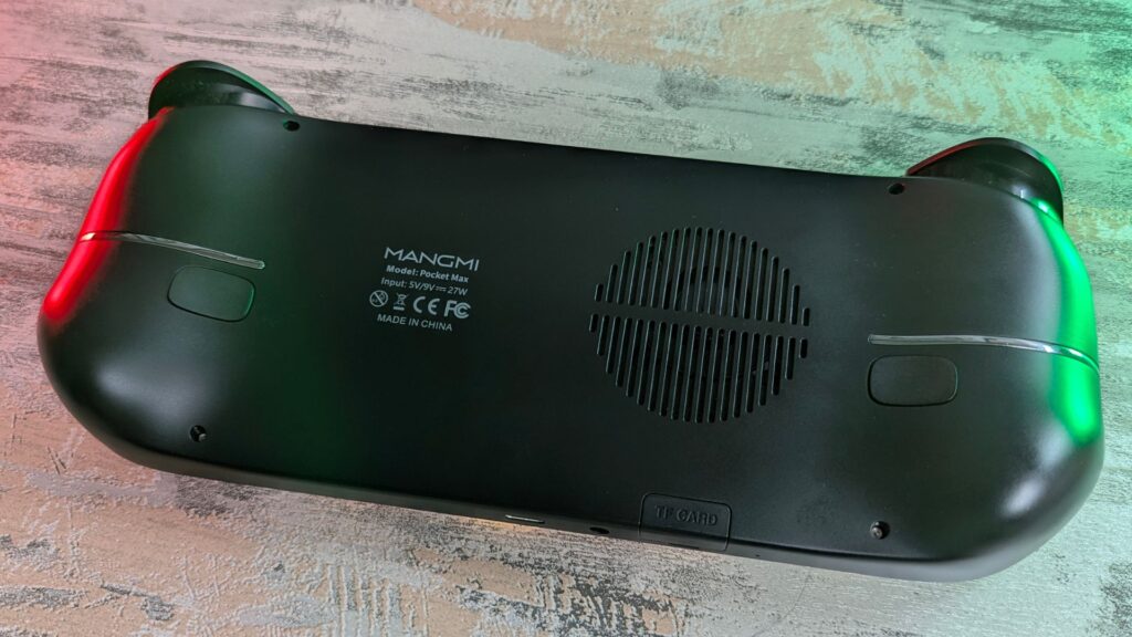 On the bottom is a covered microSD card slot, a 3.5mm audio jack, and a USB-C 3.1 port used for data and charging. You can also use this port for video output to a TV or monitor. On the back are two macro buttons, which you can configure in the settings.