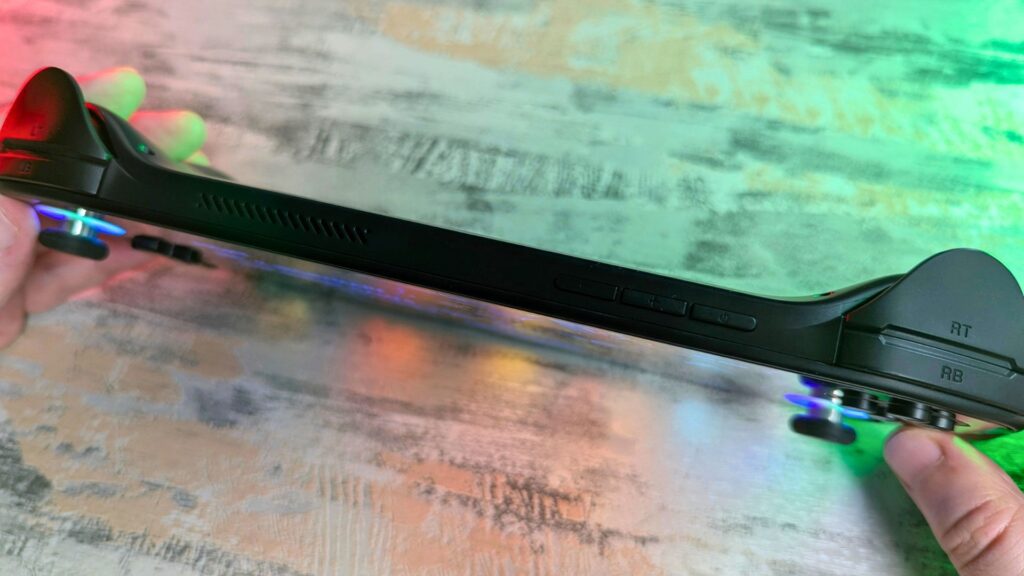 On the top are a pair of shoulder buttons and linear Hall effect triggers. You will also find the volume buttons and power button here.