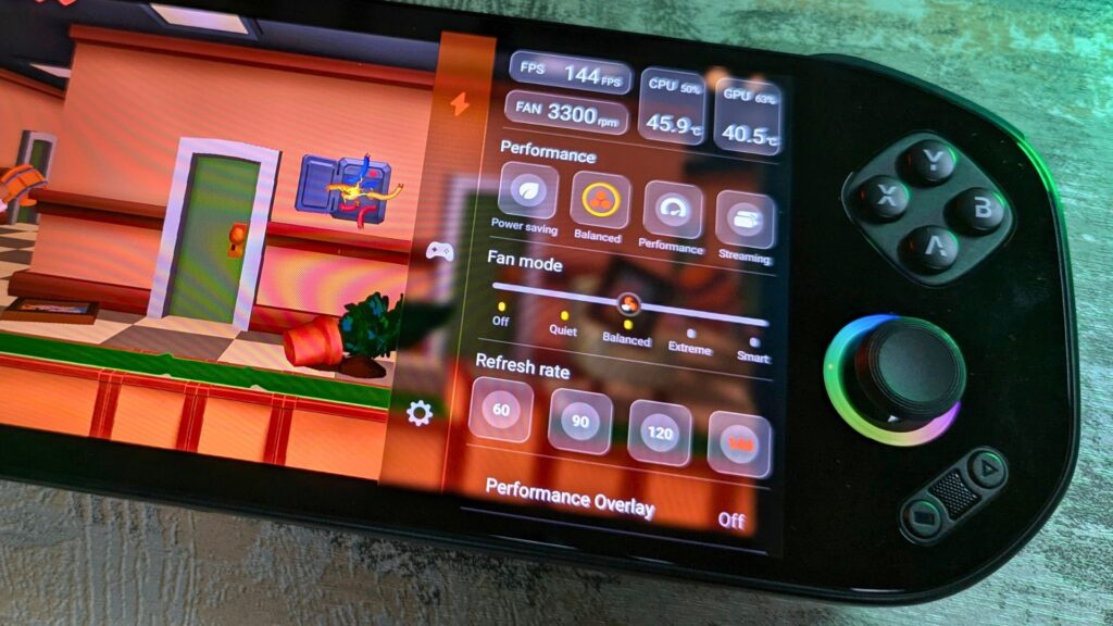 Holding the Home button for a second brings up the game overlay, and from here you have easy access to commonly used functions such as performance settings, fan speed settings, refresh rate controls, gaming controls, screenshots, and more. It all works very well and is not too cluttered, so everything is easy to recognise and use at a glance.