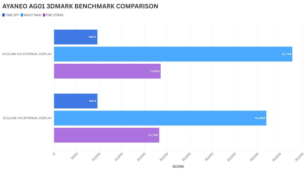 Nell'ambito della nostra recensione di AYANEO AG01 abbiamo eseguito alcuni benchmark per confrontare le prestazioni utilizzando OCuLink con AYANEO 3, con il display interno e con un monitor 4K per la visualizzazione esterna.