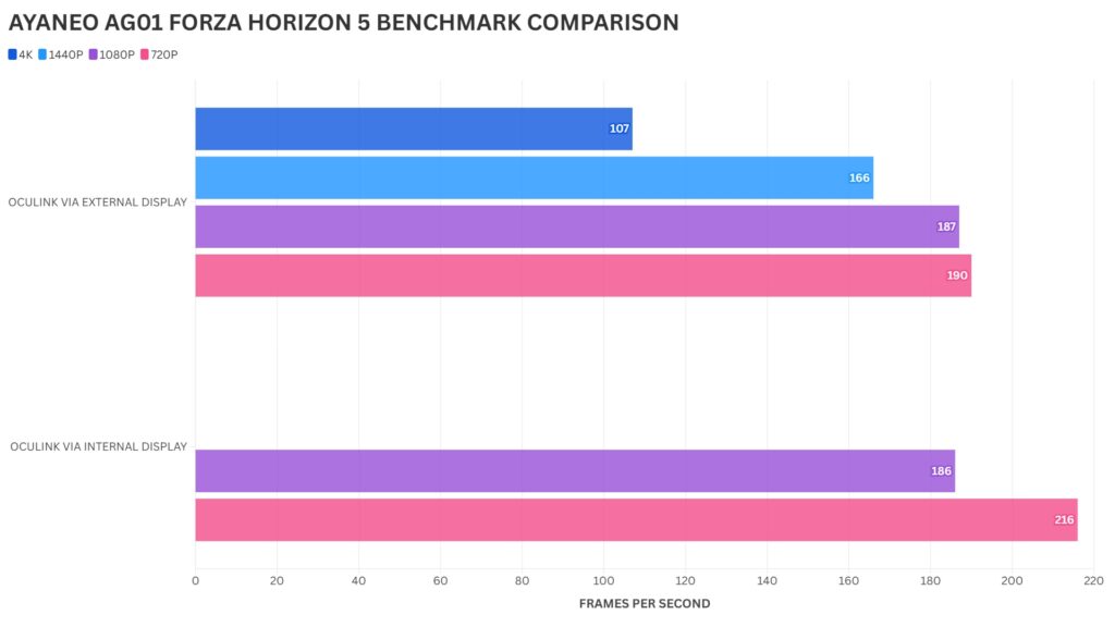 Per Forza Horizon 5 stiamo utilizzando le impostazioni grafiche Molto basse senza FSR abilitato. A 4K vediamo una fluidità di 107 fotogrammi al secondo. Scendendo la risoluzione a 720P, vediamo 190 fotogrammi al secondo. Anche il display interno si comporta molto bene, con 26 fotogrammi al secondo in più a 720P!