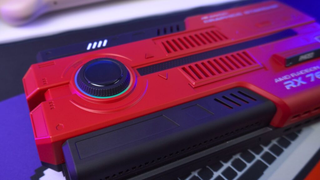 Questo è il modello Nebula Red e i suoi colori contrastanti rosso e nero con testo argentato spiccano davvero. Le prese d'aria sembrano finestre di osservazione sul lato. E lo scarico delle ventole, che assomiglia a due gondole del motore, richiede un'illuminazione RGB che purtroppo non c'è.