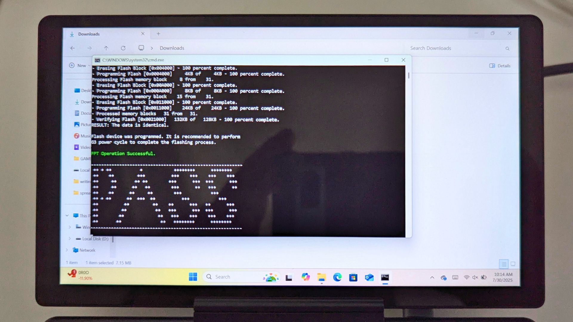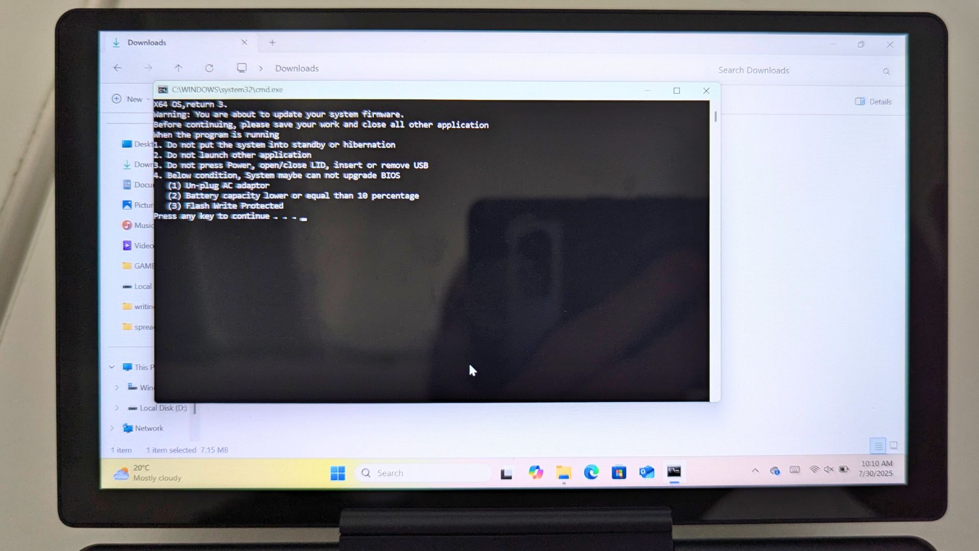 Double click on the BIOS_M2_V2.13_GPD.exe and accept any Administrator access prompts. After a few moments a command prompt window will display
