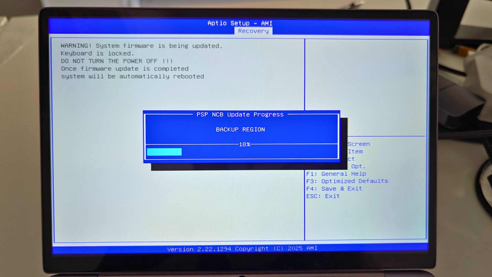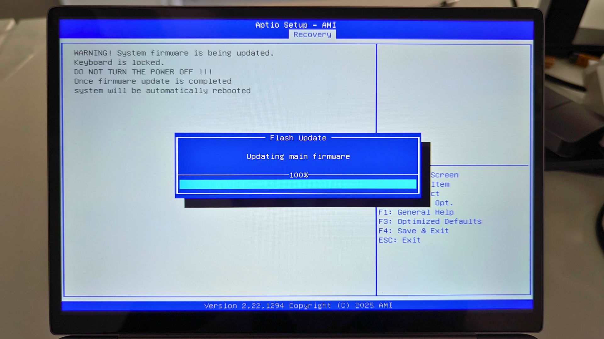 The BIOS flashing screen will now show. It will appear to do nothing for around 30 seconds. Do not press any keys or power down the device.