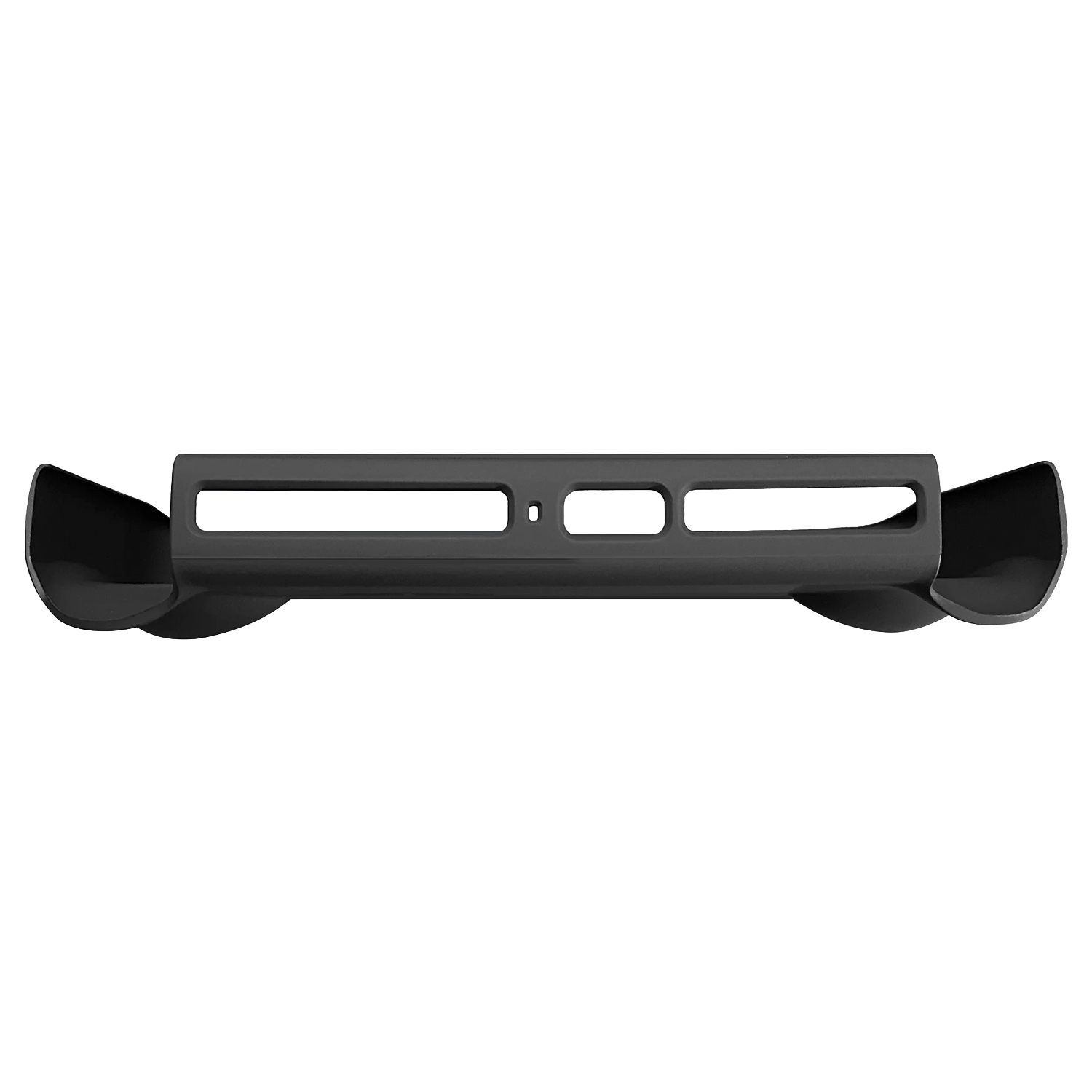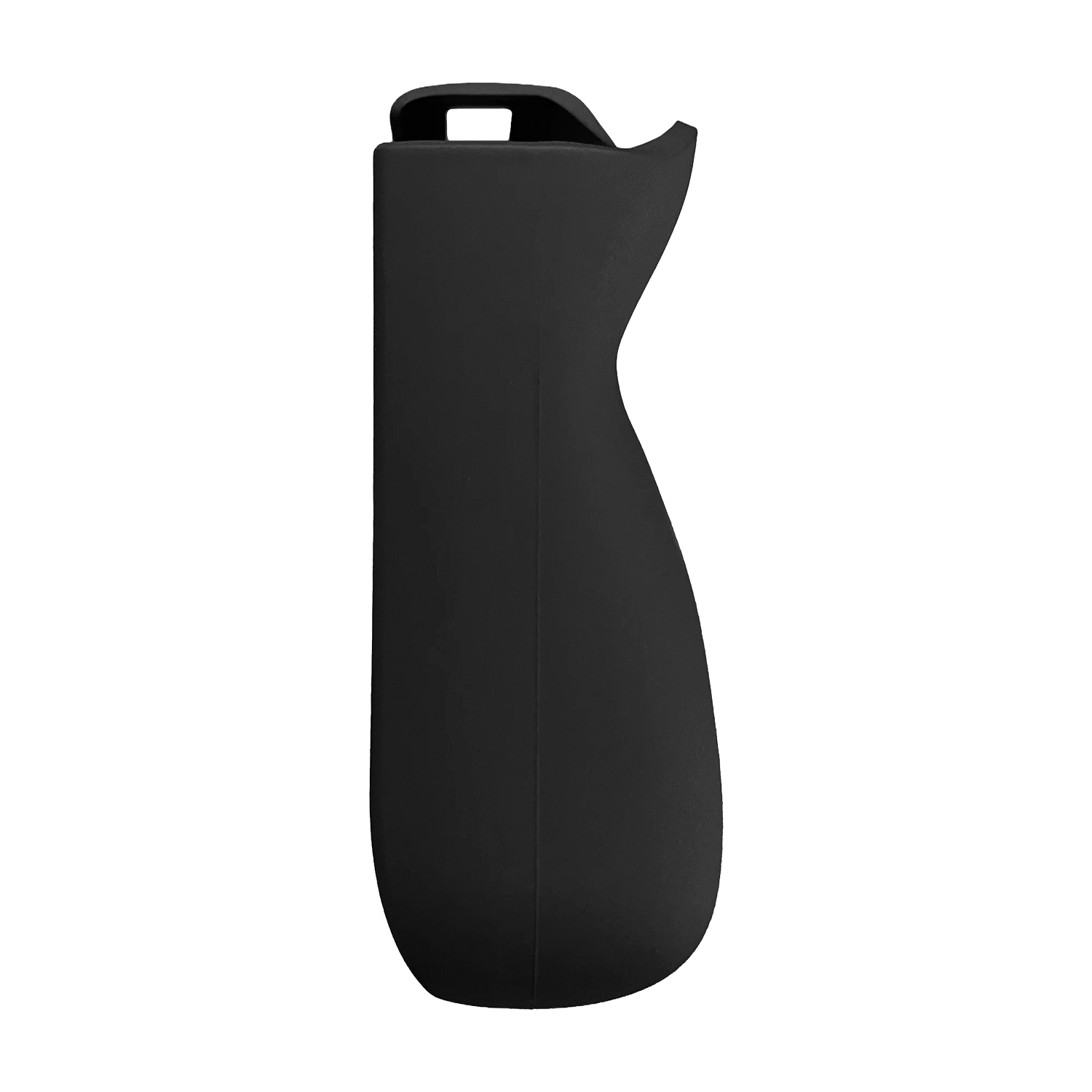 A side view of a single black ergonomic grip accessory for the AYANEO Pocket ACE against a solid grey background The grip features a curved design meant to fit a hand and a slot at the top for attaching to the device