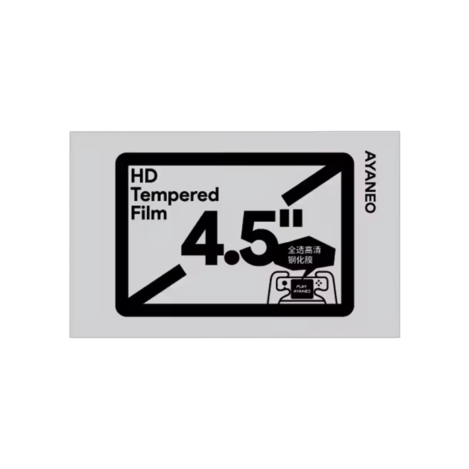 A gray rectangular package for a screen protector centered against a plain white background The front of the package features large black text HD Tempered Film on the left and a prominent 45 with a diagonal line extending from its top right Below the 45 theres smaller Chinese text 全透高清 钢化膜 Full Transparent High Definition Tempered Film and a white outline of a handheld gaming device with PLAY AYANEO on its screen The right side of the package has AYANEO written vertically