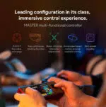 The device features an innovative control layout for comfort and responsiveness. It includes Hall joysticks, L1/L2/R1/R2 shoulder keys with varying heights, and a tap switch button. Additional controls include a master all-around handle, X-axis linear motor for vibration feedback, and a six-axis gyroscope for enhanced gaming control.