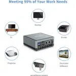 Connectivity and Ports: This mini PC is equipped with a comprehensive array of ports, including 1x USB 3.1 Type-C, 4x USB Type-A 3.0, 1x DisplayPort (4K@60Hz), 1x HDMI (4K@60Hz), and an additional video output via USB 3.2 Type-C. For audio, it features a 3.5mm headphone and microphone combo jack. The dual RJ45 Ethernet ports support 2500Mbps speeds, ensuring reliable wired connections, while the dual-band Wi-Fi (IEEE 802.11 a/b/g/n/ac) and Bluetooth 5.1 provide versatile wireless connectivity options.